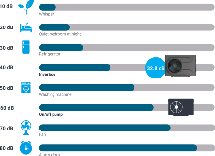 InverEco runs at full speed at the beginning of the season to heat your pool faster. Once close to reaching set temperature, it will adjust to low speed operation and maintain stable temperature throughout the season. lnverEco will achieve double energy saving compared to single-speed On/Off heat pumps.